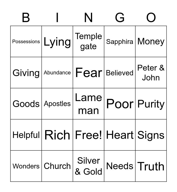 This bingo card has 26 words: Free!, Needs, Fear, Church, Money, Possessions, Giving, Lying, Purity, Heart, Believed, Goods, Signs, Wonders, Apostles, Ananias, Sapphira, Helpful, Temple gate, Lame man, Peter & John, Silver & Gold, Poor, Rich, Abundance and Truth.