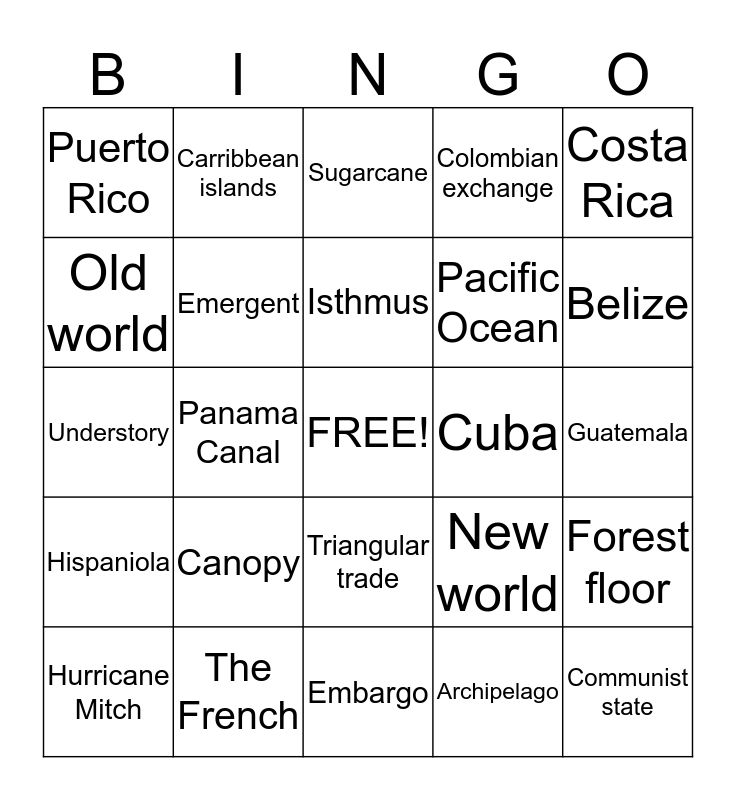 This bingo card has a free space and 24 words: Canopy, The French, Isthmus, Hurricane Mitch, Costa Rica, Puerto Rico, Old world, Carribbean islands, Cuba, Triangular trade, Pacific Ocean, Understory, New world, Forest floor, Emergent, Archipelago, Guatemala, Sugarcane, Belize, Panama Canal, Communist state, Hispaniola, Colombian exchange and Embargo.