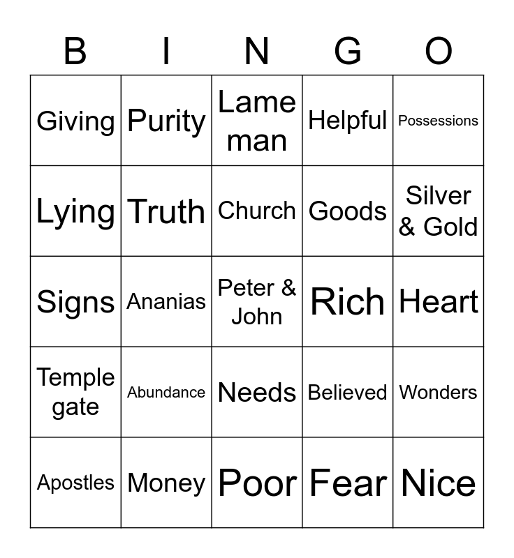 This bingo card has 26 words: Needs, Fear, Church, Money, Possessions, Giving, Lying, Purity, Heart, Believed, Goods, Signs, Wonders, Apostles, Ananias, Sapphira, Helpful, Temple gate, Lame man, Peter & John, Silver & Gold, Poor, Rich, Abundance, Truth and Nice.