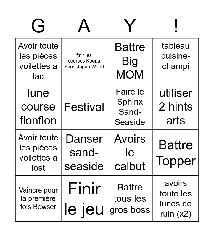This bingo card has 16 words: Finir le jeu, Battre Topper, Battre Big MOM, Avoir toute les pièces voilettes a lac, Avoir toute les pièces voilettes a lost, finir les courses Koopa Sand,Japan,Wood, Avoirs le calbut, Battre tous les gros boss, lune course flonflon, Festival, Vaincre pour la première fois Bowser, tableau cuisine-champi, Danser sand-seaside, utiliser 2 hints arts, Faire le Sphinx Sand-Seaside and avoirs toute les lunes de ruin (x2).
