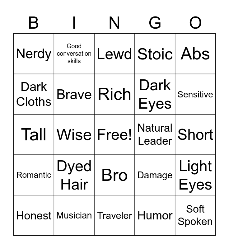 This bingo card has a free space and 24 words: Dyed Hair, Musician, Rich, Honest, Abs, Nerdy, Dark Cloths, Good conversation skills, Natural Leader, Bro, Dark Eyes, Tall, Damage, Light Eyes, Brave, Humor, Short, Lewd, Sensitive, Wise, Soft Spoken, Romantic, Stoic and Traveler.