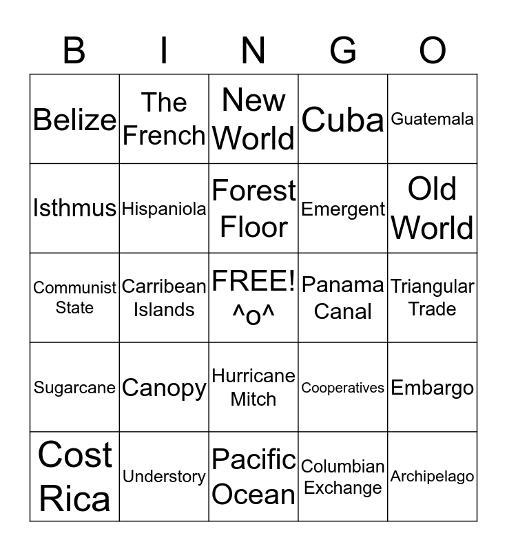 This bingo card has a free space and 24 words: Canopy, Understory, Forest Floor, Cost Rica, Guatemala, Belize, Isthmus, The French, Panama Canal, Hurricane Mitch, Emergent, Communist State, Cooperatives, Embargo, Hispaniola, Columbian Exchange, Triangular Trade, New World, Old World, Carribean Islands, Archipelago, Sugarcane, Cuba and Pacific Ocean.
