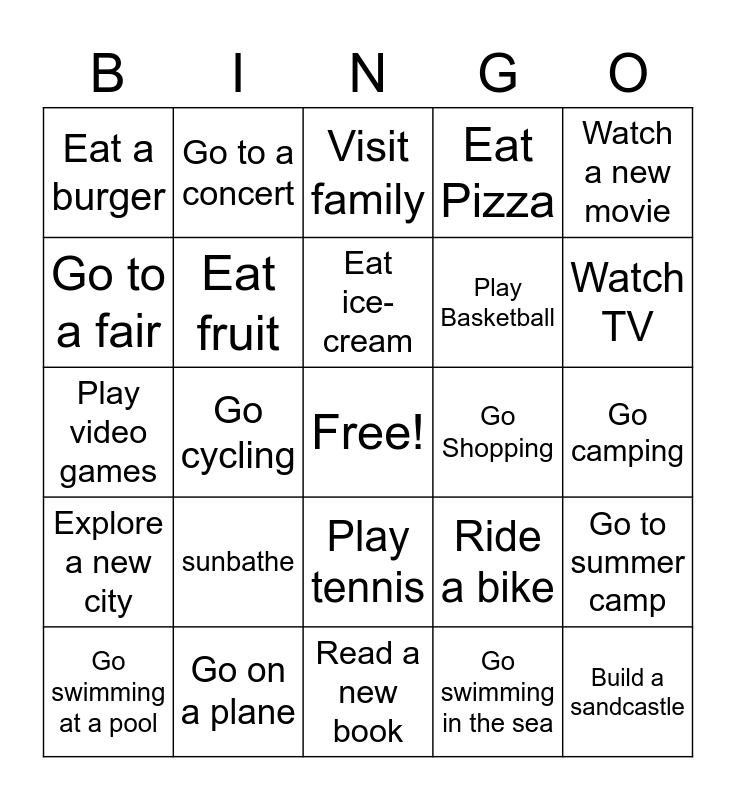 This bingo card has a free space and 24 words: sunbathe, Go on a plane, Eat ice-cream, Go swimming at a pool, Watch a new movie, Eat a burger, Go to a fair, Go to a concert, Go Shopping, Play tennis, Play Basketball, Play video games, Ride a bike, Go to summer camp, Eat fruit, Go swimming in the sea, Go camping, Visit family, Watch TV, Go cycling, Build a sandcastle, Explore a new city, Eat Pizza and Read a new book.