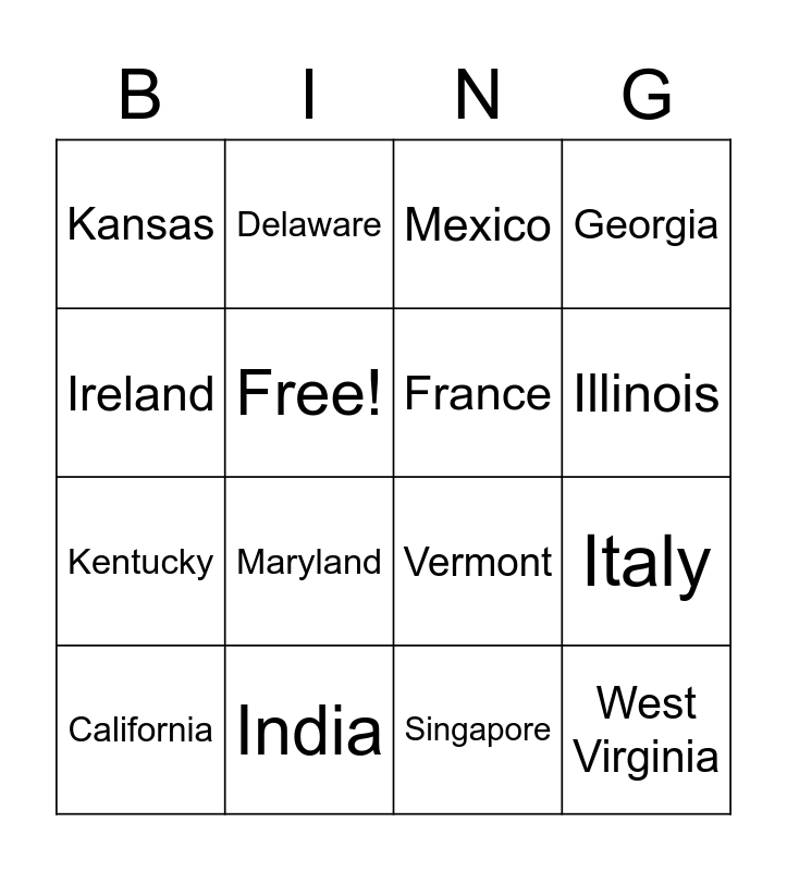 This bingo card has 50 words: Belize, California, Canada, China, Colorado, Connecticut, Delaware, England, Free!, Florida, France, Georgia, Germany, Greece, Hawaii, Honduras, Illinois, India, Indiana, Ireland, Italy, Japan, Kansas, Kentucky, Louisiana, Maine, Maryland, Massachusetts, Mexico, Missouri, New Hampshire, New Jersey, New York, North Carolina, Ohio, Pennsylvania, Qatar, Rhode Island, Saudi Arabia, Singapore, South Carolina, Tennessee, Texas, UAE, Utah, Vermont, Virginia, Washington, D.C., West Virginia and Wyoming.