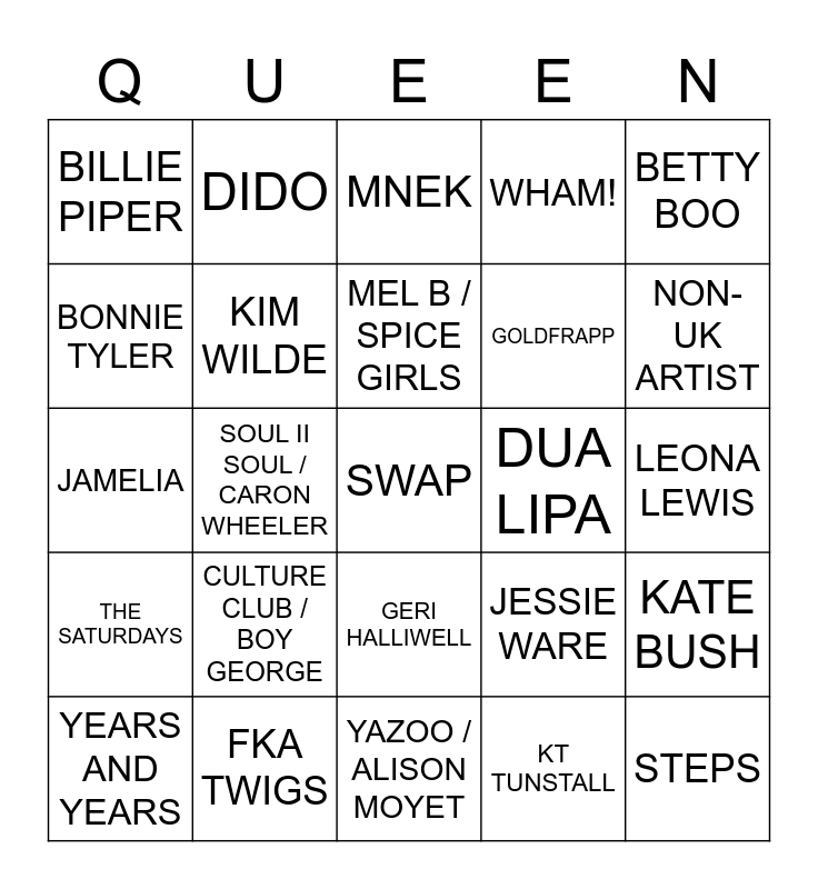 This bingo card has a free space and 24 words: CULTURE CLUB / BOY GEORGE, FKA TWIGS, MEL B / SPICE GIRLS, YEARS AND YEARS, BETTY BOO, BILLIE PIPER, BONNIE TYLER, DIDO, DUA LIPA, GERI HALLIWELL, GOLDFRAPP, JAMELIA, JESSIE WARE, KATE BUSH, KIM WILDE, KT TUNSTALL, LEONA LEWIS, MNEK, NON-UK ARTIST, SOUL II SOUL / CARON WHEELER, STEPS, THE SATURDAYS, WHAM! and YAZOO / ALISON MOYET.