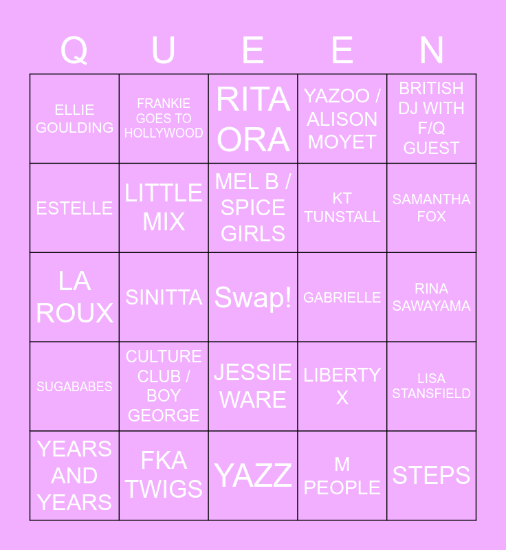 This bingo card has a free space and 24 words: CULTURE CLUB / BOY GEORGE, FKA TWIGS, MEL B / SPICE GIRLS, YEARS AND YEARS, BRITISH DJ WITH F/Q GUEST, ELLIE GOULDING, ESTELLE, FRANKIE GOES TO HOLLYWOOD, GABRIELLE, JESSIE WARE, KT TUNSTALL, LA ROUX, LIBERTY X, LISA STANSFIELD, LITTLE MIX, M PEOPLE, RINA SAWAYAMA, RITA ORA, SAMANTHA FOX, SINITTA, STEPS, SUGABABES, YAZOO / ALISON MOYET and YAZZ.