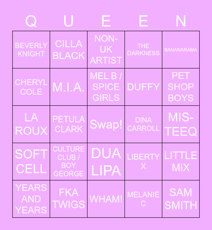 This bingo card has a free space and 24 words: CULTURE CLUB / BOY GEORGE, FKA TWIGS, MEL B / SPICE GIRLS, YEARS AND YEARS, BANANARAMA, BEVERLY KNIGHT, CHERYL COLE, CILLA BLACK, DINA CARROLL, DUA LIPA, DUFFY, LA ROUX, LIBERTY X, LITTLE MIX, M.I.A., MELANIE C, MIS-TEEQ, NON-UK ARTIST, PET SHOP BOYS, PETULA CLARK, SAM SMITH, SOFT CELL, THE DARKNESS and WHAM!.