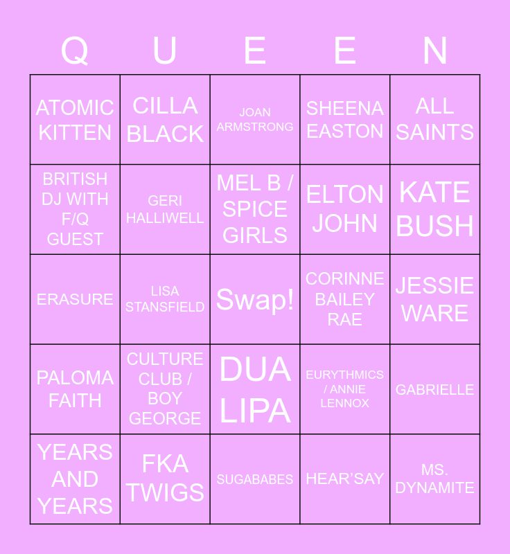 This bingo card has a free space and 24 words: CULTURE CLUB / BOY GEORGE, FKA TWIGS, MEL B / SPICE GIRLS, YEARS AND YEARS, ALL SAINTS, ATOMIC KITTEN, BRITISH DJ WITH F/Q GUEST, CILLA BLACK, CORINNE BAILEY RAE, DUA LIPA, ELTON JOHN, ERASURE, EURYTHMICS / ANNIE LENNOX, GABRIELLE, GERI HALLIWELL, HEAR’SAY, JESSIE WARE, JOAN ARMSTRONG, KATE BUSH, LISA STANSFIELD, MS. DYNAMITE, PALOMA FAITH, SHEENA EASTON and SUGABABES.