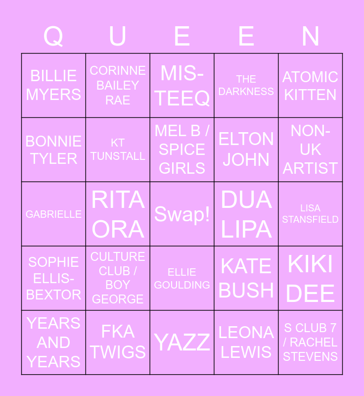 This bingo card has a free space and 24 words: CULTURE CLUB / BOY GEORGE, FKA TWIGS, MEL B / SPICE GIRLS, YEARS AND YEARS, ATOMIC KITTEN, BILLIE MYERS, BONNIE TYLER, CORINNE BAILEY RAE, DUA LIPA, ELLIE GOULDING, ELTON JOHN, GABRIELLE, KATE BUSH, KIKI DEE, KT TUNSTALL, LEONA LEWIS, LISA STANSFIELD, MIS-TEEQ, NON-UK ARTIST, RITA ORA, S CLUB 7 / RACHEL STEVENS, SOPHIE ELLIS-BEXTOR, THE DARKNESS and YAZZ.