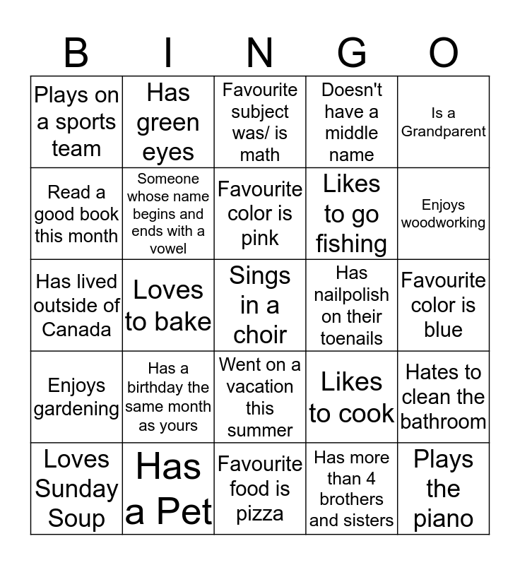This bingo card has a free space and 24 words: Has a birthday the same month as yours, Has a Pet, Favourite color is pink, Loves Sunday Soup, Is a Grandparent, Plays on a sports team, Read a good book this month, Has green eyes, Has nailpolish on their toenails, Went on a vacation this summer, Likes to go fishing, Has lived outside of Canada, Likes to cook, Hates to clean the bathroom, Someone whose name begins and ends with a vowel, Has more than 4 brothers and sisters, Favourite color is blue, Favourite subject was/ is math, Enjoys woodworking, Loves to bake, Plays the piano, Enjoys gardening, Doesn't have a middle name and Favourite food is pizza.