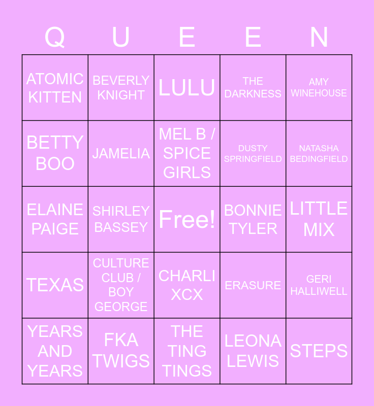 This bingo card has a free space and 24 words: CULTURE CLUB / BOY GEORGE, FKA TWIGS, MEL B / SPICE GIRLS, YEARS AND YEARS, AMY WINEHOUSE, ATOMIC KITTEN, BETTY BOO, BEVERLY KNIGHT, BONNIE TYLER, CHARLI XCX, DUSTY SPRINGFIELD, ELAINE PAIGE, ERASURE, GERI HALLIWELL, JAMELIA, LEONA LEWIS, LITTLE MIX, LULU, NATASHA BEDINGFIELD, SHIRLEY BASSEY, STEPS, TEXAS, THE DARKNESS and THE TING TINGS.