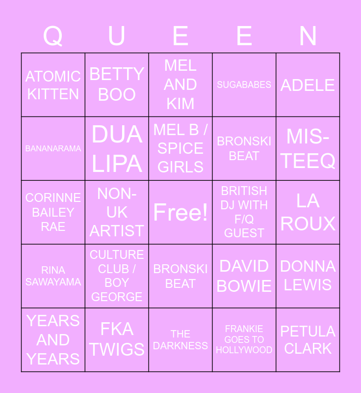 This bingo card has a free space and 24 words: CULTURE CLUB / BOY GEORGE, FKA TWIGS, MEL B / SPICE GIRLS, YEARS AND YEARS, ADELE, ATOMIC KITTEN, BANANARAMA, BETTY BOO, BRITISH DJ WITH F/Q GUEST, BRONSKI BEAT, BRONSKI BEAT, CORINNE BAILEY RAE, DAVID BOWIE, DONNA LEWIS, DUA LIPA, FRANKIE GOES TO HOLLYWOOD, LA ROUX, MEL AND KIM, MIS-TEEQ, NON-UK ARTIST, PETULA CLARK, RINA SAWAYAMA, SUGABABES and THE DARKNESS.