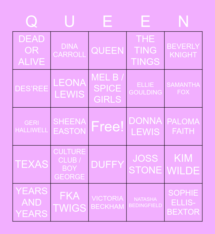 This bingo card has a free space and 24 words: CULTURE CLUB / BOY GEORGE, FKA TWIGS, MEL B / SPICE GIRLS, YEARS AND YEARS, BEVERLY KNIGHT, DEAD OR ALIVE, DES’REE, DINA CARROLL, DONNA LEWIS, DUFFY, ELLIE GOULDING, GERI HALLIWELL, JOSS STONE, KIM WILDE, LEONA LEWIS, NATASHA BEDINGFIELD, PALOMA FAITH, QUEEN, SAMANTHA FOX, SHEENA EASTON, SOPHIE ELLIS-BEXTOR, TEXAS, THE TING TINGS and VICTORIA BECKHAM.