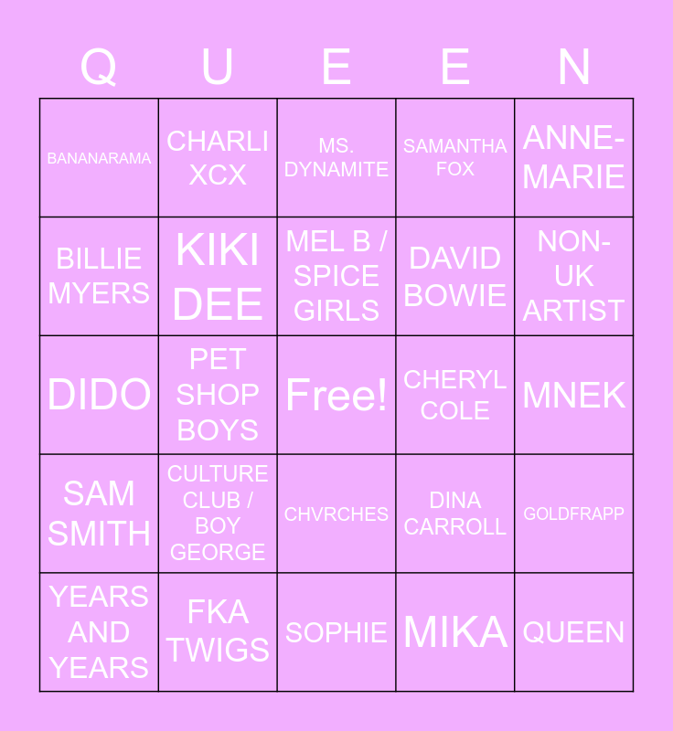 This bingo card has a free space and 24 words: CULTURE CLUB / BOY GEORGE, FKA TWIGS, MEL B / SPICE GIRLS, YEARS AND YEARS, ANNE-MARIE, BANANARAMA, BILLIE MYERS, CHARLI XCX, CHERYL COLE, CHVRCHES, DAVID BOWIE, DIDO, DINA CARROLL, GOLDFRAPP, KIKI DEE, MIKA, MNEK, MS. DYNAMITE, NON-UK ARTIST, PET SHOP BOYS, QUEEN, SAM SMITH, SAMANTHA FOX and SOPHIE.