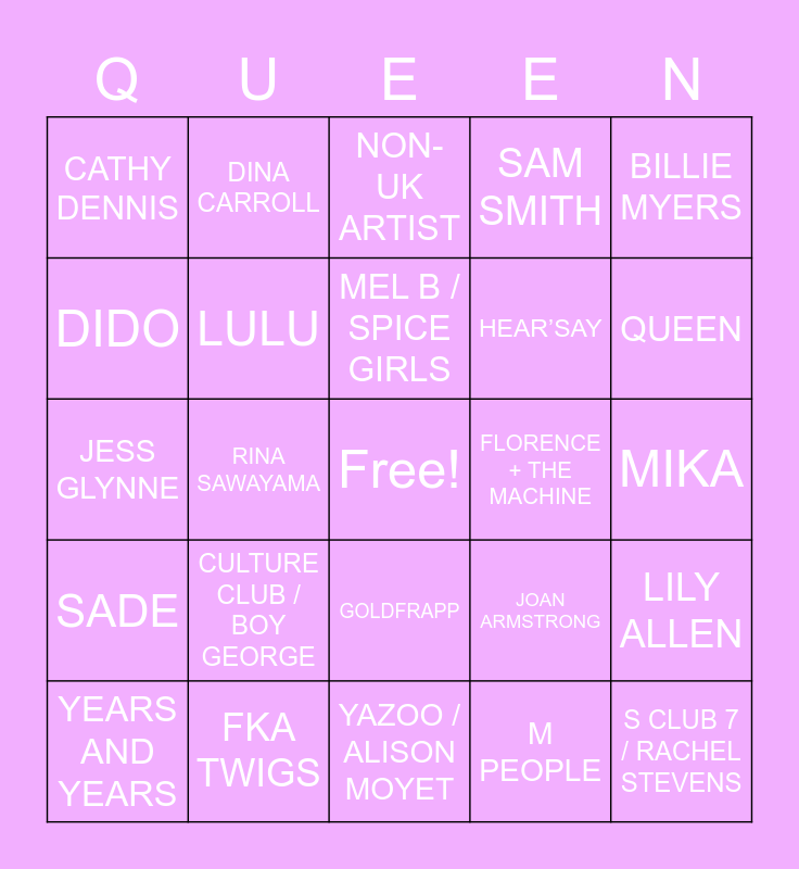 This bingo card has a free space and 24 words: CULTURE CLUB / BOY GEORGE, FKA TWIGS, MEL B / SPICE GIRLS, YEARS AND YEARS, BILLIE MYERS, CATHY DENNIS, DIDO, DINA CARROLL, FLORENCE + THE MACHINE, GOLDFRAPP, HEAR’SAY, JESS GLYNNE, JOAN ARMSTRONG, LILY ALLEN, LULU, M PEOPLE, MIKA, NON-UK ARTIST, QUEEN, RINA SAWAYAMA, S CLUB 7 / RACHEL STEVENS, SADE, SAM SMITH and YAZOO / ALISON MOYET.