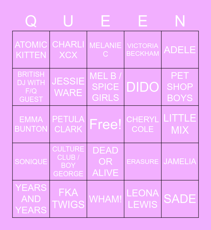 This bingo card has a free space and 24 words: CULTURE CLUB / BOY GEORGE, FKA TWIGS, MEL B / SPICE GIRLS, YEARS AND YEARS, ADELE, ATOMIC KITTEN, BRITISH DJ WITH F/Q GUEST, CHARLI XCX, CHERYL COLE, DEAD OR ALIVE, DIDO, EMMA BUNTON, ERASURE, JAMELIA, JESSIE WARE, LEONA LEWIS, LITTLE MIX, MELANIE C, PET SHOP BOYS, PETULA CLARK, SADE, SONIQUE, VICTORIA BECKHAM and WHAM!.