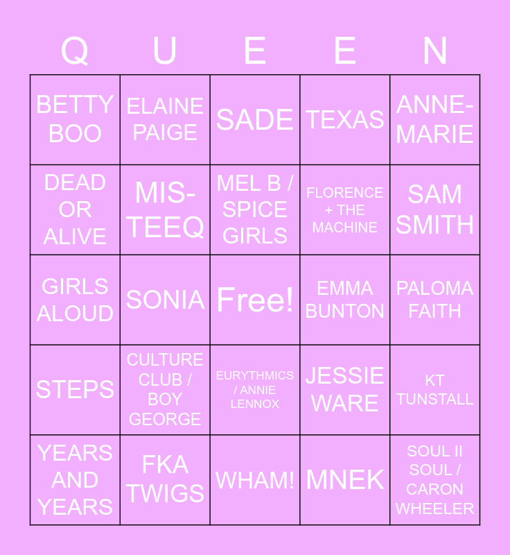 This bingo card has a free space and 24 words: CULTURE CLUB / BOY GEORGE, FKA TWIGS, MEL B / SPICE GIRLS, YEARS AND YEARS, ANNE-MARIE, BETTY BOO, DEAD OR ALIVE, ELAINE PAIGE, EMMA BUNTON, EURYTHMICS / ANNIE LENNOX, FLORENCE + THE MACHINE, GIRLS ALOUD, JESSIE WARE, KT TUNSTALL, MIS-TEEQ, MNEK, PALOMA FAITH, SADE, SAM SMITH, SONIA, SOUL II SOUL / CARON WHEELER, STEPS, TEXAS and WHAM!.