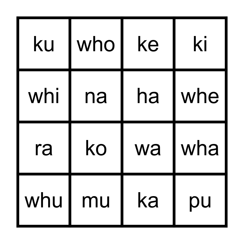 This bingo card has 16 words: mu, wha, ke, ku, ra, who, wa, ka, whi, na, whu, ki, ko, whe, ha and pu.
