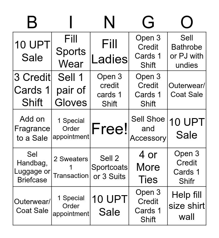 This bingo card has a free space and 24 words: 2 Sweaters 1 Transaction, 1 Special Order appointment, Open 3 credit cards 1 Shift, Outerwear/ Coat Sale, Sell Bathrobe or PJ with undies, 10 UPT Sale, 3 Credit Cards 1 Shift, Fill Sports Wear, Sell Shoe and Accessory, Sell 2 Sportcoats or 3 Suits, Open 3 Credit Cards 1 Shift, Add on Fragrance to a Sale, 4 or More Ties, Open 3 Credit Cards 1 Shifr, Sell 1 pair of Gloves, Open 3 Credit Cards 1 Shift, 10 UPT Sale, Fill Ladies, Outerwear/ Coat Sale, 1 Special Order appointment, Help fill size shirt wall, Sel Handbag, Luggage or Briefcase, Open 3 Credit Cards 1 Shift and 10 UPT Sale.