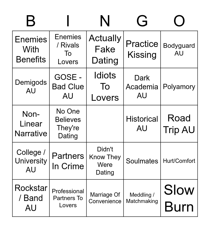 This bingo card has a free space and 99 words: 3+1 / 5+1 Things, Accidental Relationship, Acts Of Service, Actually Fake Dating, Angst With A Happy Ending, Arranged Marriage, Bad Flirting, Banter / Bickering, Based On Other Media, Character Study, Childhood Friends, Childhood Friends To Lovers, Confessions, Didn't Know They Were Dating, Domesticity, Enemies With Benefits, Enemies / Rivals To Lovers, Established Relationship, Exes To Lovers, Fake Relationship, Found Family, Friends To Lovers, Friends With Benefits, Happy Ending, Humor, Hurt/Comfort, Idiots To Lovers, Jealousy, Late-Night Conversations, Love Languages, Marriage Of Convenience, Meddling / Matchmaking, Morally Gray Characters, Mutual Pining, No One Believes They're Dating, Non-Linear Narrative, Not Actually Unrequited Love, Only One Bed, Opposites Attract, Partners In Crime, Pining, Polyamory, Practice Kissing, Professional Partners To Lovers, Right Person Wrong Time, Road Trip, Romcom, Roommates, Secret Relationship, Sharing Dreams, Slice Of Life, Slow Burn, Soulmates, Strangers To Lovers, Stuck Together / Forced Proximity, Time Loop, Trope Subversion, Unrequited Love, Unrequited Rivalry, Very Obvious A Very Oblivious B, We Kissed Once But We Don't Talk About It, Wound Tending, Angels and Demons AU, Bakery AU, Boarding School AU, Bodyguard AU, Canon Divergent AU, Canon-Compliant AU, Coffee Shop AU, College / University AU, Crime / Criminals AU, Dark Academia AU, Demigods AU, Fantasy AU, Florist x Tattoo Artist AU, Folklore / Mythology AU, GOSE - Bad Clue AU, GOSE - Ego AU, GOSE - Wonwoo's Diary AU, Heist AU, Historical AU, Hospital AU, Lawyers AU, Magical AU, Modern With Magic AU, Non-Idol Celebrity AU, Non-Traditional A/B/O AU, Office AU, Road Trip AU, Rockstar / Band AU, Royalty AU, Science Fiction AU, Soulmate AU, Sports AU, Spy AU, Superpowers / Superhero AU, Urban Fantasy AU, Vampire AU and Wedding Planner AU.