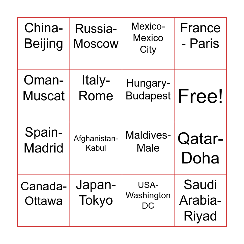 This bingo card has 17 words: USA- Washington DC, Canada- Ottawa, Mexico- Mexico City, China- Beijing, Afghanistan- Kabul, France - Paris, Qatar- Doha, Hungary- Budapest, Free!, Italy- Rome, Japan- Tokyo, Maldives- Male, Oman- Muscat, Russia- Moscow, Spain- Madrid, UAE- Abu Dhabi and Saudi Arabia- Riyad.