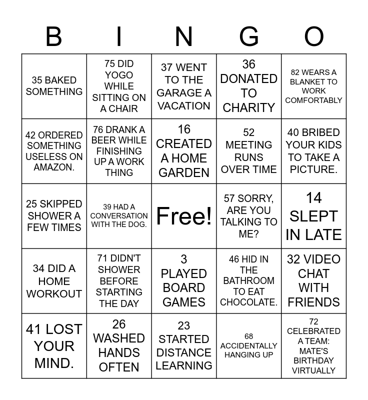 This bingo card has a free space and 90 words: 1 WORE A FACE MASK, 2 LEARNED A NEW LANGUAGE, 3 PLAYED BOARD GAMES, 4 YOU CRIED A LOT, 5 YOU STARTED JOURNALING, 6 MADE A POST-QUARANTINE BUCKET LIST, 7 SELF-ISOLATED FOR 2 WEEKS, 8 PLAYED VIDEO GAMES, 9 ATTENDED A VIRTUAL WEDDING, 10 WENT ON A PROTEST, 11 TRIED YOGA, 12 CUT YOUR OWN HAIR, 13 BOUGHT A TREADMILL, 14 SLEPT IN LATE, 15 READ A BOOK, 16 CREATED A HOME GARDEN, 17 REARRANGED FURNITURE, 18 PAINTED A PICTURE, 19 ADOPTED A DOG, 20 TOOK PET FOR A WALK, 21 TRIED A NEW RECIPE, 22 CANCELLED TRAVEL PLANS, 23 STARTED DISTANCE LEARNING, 24 TOOK AN ONLINE COURSE, 25 SKIPPED SHOWER A FEW TIMES, 26 WASHED HANDS OFTEN, 27 JOINED AN ONLINE DATING SITE, 28 TOOK MY TEMPERATURE, 29 BOUGHT EXTRA HAND SANITIZERS, 30 FORGOT WHAT DAY IT WAS, 31 STAYED 6-FEET APART, 32 VIDEO CHAT WITH FRIENDS, 33 GOT TESTED FOR COVID, 34 DID A HOME WORKOUT, 35 BAKED SOMETHING, 36 DONATED TO CHARITY, 37 WENT TO THE GARAGE A VACATION, 38 ASKED ALEXA WHAT DAY IT WAS., 39 HAD A CONVERSATION WITH THE DOG., 40 BRIBED YOUR KIDS TO TAKE A PICTURE., 41 LOST YOUR MIND., 42 ORDERED SOMETHING USELESS ON AMAZON., 43 REHEATED YOUR COFFEE MORE THAN 7 TIMES., 44 BEEN SO BORED YOU TOOK PICS OF THE CEILING FAN., 45 PAID A CHILD TO LEAVE YOU ALONE., 46 HID IN THE BATHROOM TO EAT CHOCOLATE., 47 PRETTY FOR LIFE, 48 CLEANED OUT YOUR HARD DRIVE., 49 YOU'RE ON MUTE, 50 ARE WE ALL HERE?, 51 PETS ON CAMERA, 52 MEETING RUNS OVER TIME, 53 VIDEO FREEZING, 54 MID-MEETING SNACKS, 55 ZOOMING FROM BED, 56 SOMEONE ARGUING WITH THEIR WIFE, 57 SORRY, ARE YOU TALKING TO ME?, 58 NOSE PICKING, 59 YOU CUT OUT THERE, 60 AWKWARD SMALL TALK, 61 LET'S TAKE THIS OFFLINE, 62 CHILDREN IN BACKGROUND, 63 FUN BACKGROUNDS, 64 TALKING OVER EACH OTHER, 65 I HAVE ANOTHER CALL NOW, 66 AWKWARD SILENCES, 67 TOILET BREAKS, 68 ACCIDENTALLY HANGING UP, 69 VERY LOUD TYPING, 70 CREATED A 'WORKING FROM HOME' MUSIC PLAYLIST, 71 DIDN'T SHOWER BEFORE STARTING THE DAY, 72 CELEBRATED A TEAM: MATE'S BIRTHDAY VIRTUALLY, 73 WORE SHORTS WHILE ATTENDING A CONFERENCE, 74 HAD A MEETING INTERRUPTED BY A RELATIVE OR A PET, 75 DID YOGO WHILE SITTING ON A CHAIR, 76 DRANK A BEER WHILE FINISHING UP A WORK THING, 77 WORKED FROM THE SOFA, 78 TOOK A CALL WHILE WALKING AROUND THE HOUSE, 79 SLEPT IN AND STARTED WORK LATE, 80 SHARED A VIRTUAL LUNCH WITH A COLLEAGUE, 81 WORKED FROM ANOTHER PLACE OTHER THAN HOME, 82 WEARS A BLANKET TO WORK COMFORTABLY, 83 HAS STARTED TO PRACTICE A NEW SPORT, 84 RUN OUT OF BATTERY DURING A MEETING, 85 MADE A TRENDY TIKTOK VIDEO, 86 HAD POWER/ INTERNET CUTOUT DURING A ZOOM CALL, 87 A, 88 B, 89 C and 90 D.