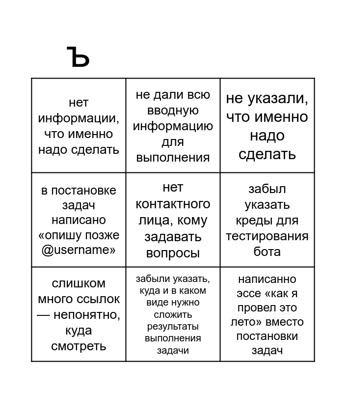This bingo card has a free space and 8 words: забыл указать креды для тестирования бота, не указали, что именно надо сделать, не дали всю вводную информацию для выполнения, слишком много ссылок — непонятно, куда смотреть, нет информации, что именно надо сделать, написанно эссе «как я провел это лето» вместо постановки задач, в постановке задач написано «опишу позже @username» and забыли указать, куда и в каком виде нужно сложить результаты выполнения задачи.