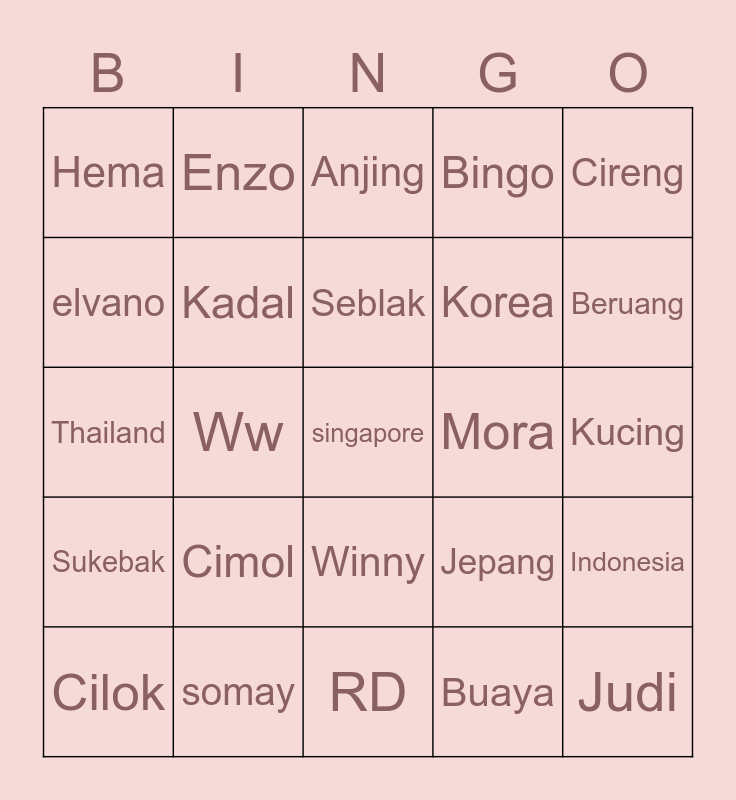 This bingo card has a free space and 24 words: Cimol, somay, Seblak, Cilok, Cireng, Hema, elvano, Enzo, Mora, Winny, Korea, Thailand, Jepang, Indonesia, Kadal, Buaya, Kucing, Anjing, Beruang, Ww, Judi, Sukebak, Bingo and RD.