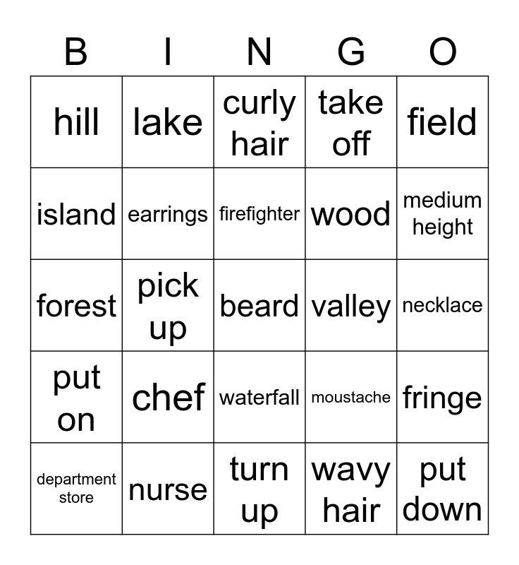 This bingo card has a free space and 24 words: chef, nurse, firefighter, department store, field, hill, island, lake, valley, waterfall, wood, forest, moustache, fringe, earrings, wavy hair, necklace, curly hair, medium height, pick up, put down, put on, take off and turn up.