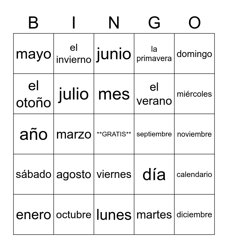 This bingo card has a free space and 29 words: enero, febrero, marzo, abril, mayo, junio, julio, agosto, septiembre, octubre, noviembre, diciembre, lunes, martes, miércoles, jueves, viernes, sábado, domingo, año, día, hoy, el verano, el otoño, la primavera, el invierno, calendario, mes and semana.