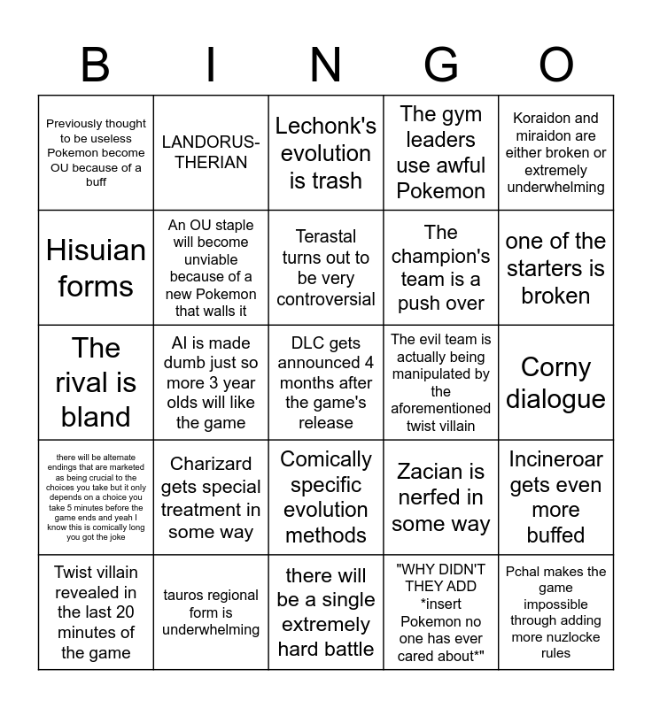 This bingo card has a free space and 24 words: Charizard gets special treatment in some way, tauros regional form is underwhelming, Terastal turns out to be very controversial, Twist villain revealed in the last 20 minutes of the game, Koraidon and miraidon are either broken or extremely underwhelming, Previously thought to be useless Pokemon become OU because of a buff, Hisuian forms, LANDORUS-THERIAN, The evil team is actually being manipulated by the aforementioned twist villain, Comically specific evolution methods, The champion's team is a push over, The rival is bland, Zacian is nerfed in some way, Incineroar gets even more buffed, An OU staple will become unviable because of a new Pokemon that walls it, "WHY DIDN'T THEY ADD *insert Pokemon no one has ever cared about*", Corny dialogue, Lechonk's evolution is trash, one of the starters is broken, AI is made dumb just so more 3 year olds will like the game, Pchal makes the game impossible through adding more nuzlocke rules, there will be alternate endings that are marketed as being crucial to the choices you take but it only depends on a choice you take 5 minutes before the game ends and yeah I know this is comically long you got the joke, The gym leaders use awful Pokemon and there will be a single extremely hard battle.