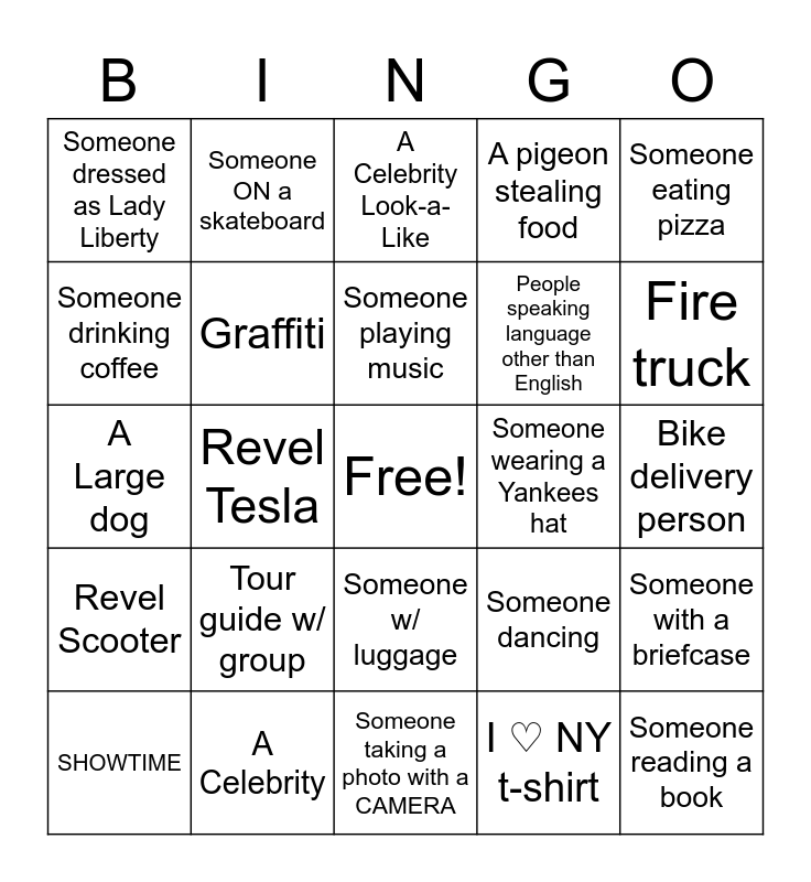 This bingo card has a free space and 35 words: Police car, Taxi w/passenger, Non-NY Sports Team baseball hat, Graffiti, Someone w/ luggage, A pigeon stealing food, Someone drinking coffee, A bicycle locked up w/ missing wheel(s), Someone playing music, A small dog, A Large dog, Someone eating pizza, Someone looking at a map (or directions), Someone on a Citi Bike, Someone dressed as Lady Liberty, Someone wearing a Yankees hat, I ♡ NY t-shirt, Revel Tesla, Revel Scooter, Someone reading a book, Someone dancing, SHOWTIME, Someone with a briefcase, A Celebrity, A Celebrity Look-a-Like, Fire truck, Double parked vehicle, Non NY/NJ/CT License Plate, People speaking language other than English, Bike delivery person, Scooter delivery person, Someone taking a photo with a CAMERA, Tour guide w/ group, Someone ON a skateboard and Money on the ground.