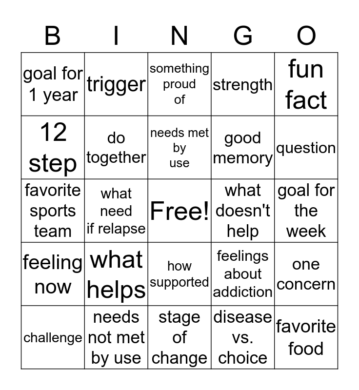 This bingo card has a free space and 24 words: what helps, needs not met by use, needs met by use, challenge, fun fact, goal for 1 year, 12 step, trigger, what doesn't help, how supported, good memory, favorite sports team, feelings about addiction, one concern, do together, disease vs. choice, goal for the week, something proud of, question, what need if relapse, favorite food, feeling now, strength and stage of change.