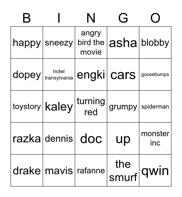 This bingo card has a free space and 24 words: dennis, mavis, engki, drake, blobby, happy, dopey, sneezy, grumpy, doc, cars, toystory, up, monster inc, hotel transylvania, the smurf, spiderman, angry bird the movie, goosebumps, kaley, qwin, razka, asha and rafanne.