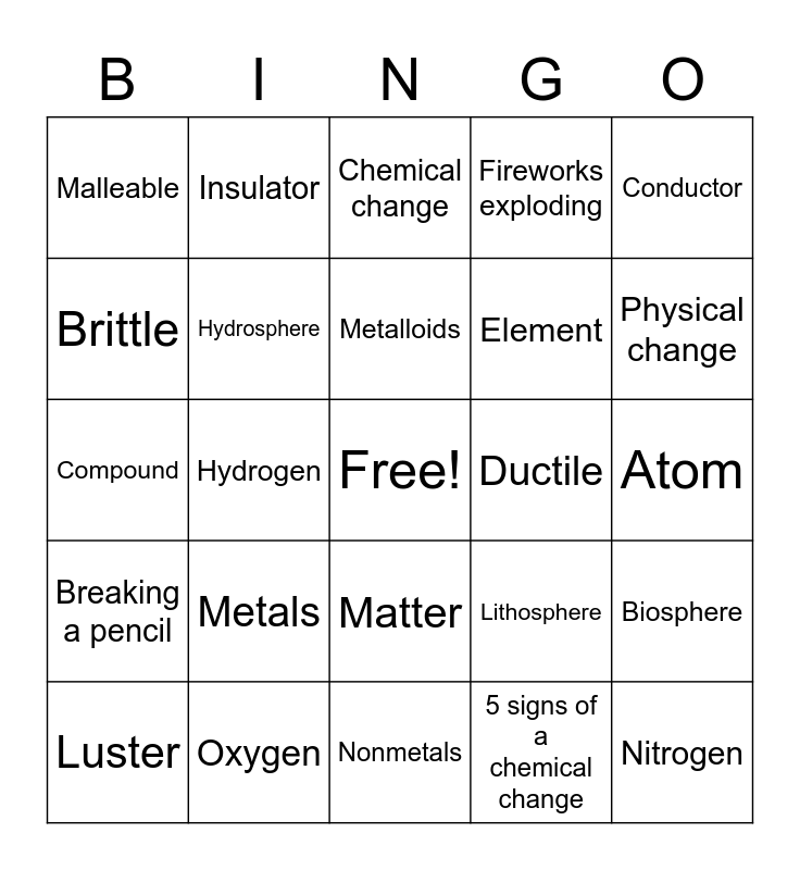 This bingo card has a free space and 25 words: Metals, Nonmetals, Metalloids, Luster, Conductor, Malleable, Brittle, Insulator, Ductile, Matter, Element, Compound, Lithosphere, Biosphere, Hydrosphere, Atmosphere, Atom, Chemical change, Physical change, Hydrogen, Nitrogen, Oxygen, Breaking a pencil, Fireworks exploding and 5 signs of a chemical change.