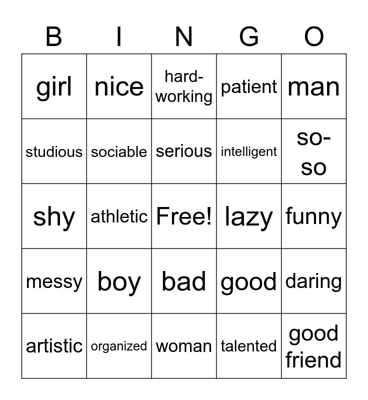This bingo card has a free space and 24 words: boy, organized, serious, artistic, man, girl, studious, nice, lazy, bad, intelligent, shy, good, daring, sociable, talented, funny, hard-working, so-so, athletic, good friend, messy, patient and woman.