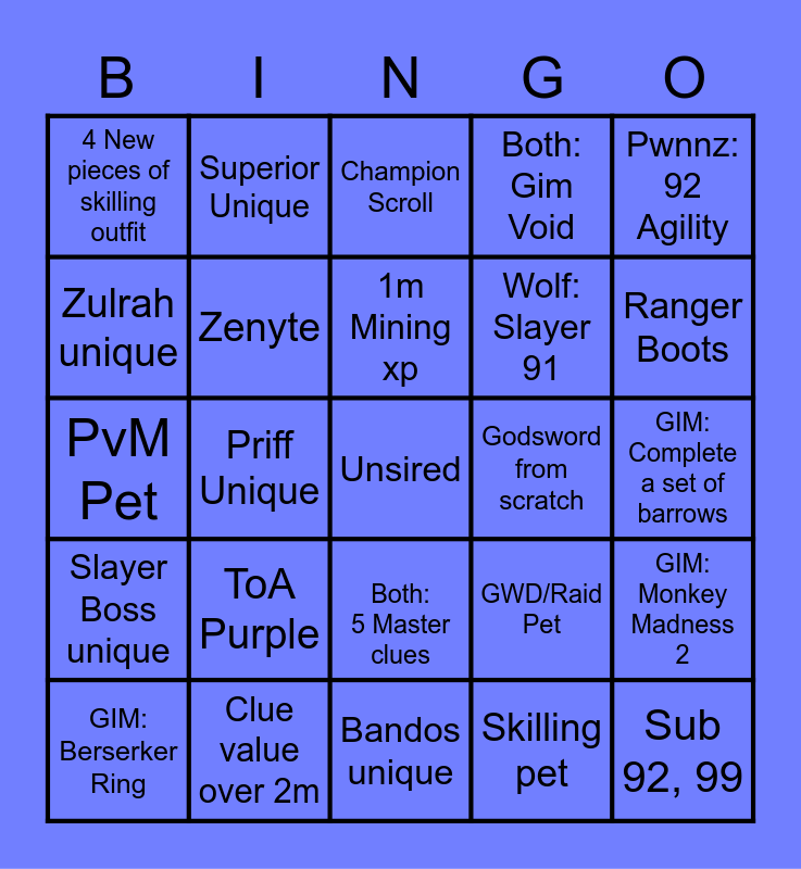 This bingo card has 25 words: ToA Purple, Bandos unique, 1m Mining xp, GIM: Berserker Ring, Pwnnz: 92 Agility, 4 New pieces of skilling outfit, Zulrah unique, Superior Unique, Godsword from scratch, Both: 5 Master clues, Wolf: Slayer 91, PvM Pet, GWD/Raid Pet, GIM: Monkey Madness 2, Zenyte, Sub 92, 99, GIM: Complete a set of barrows, Champion Scroll, Ranger Boots, Priff Unique, Unsired, Clue value over 2m, Slayer Boss unique, Both: Gim Void and Skilling pet.