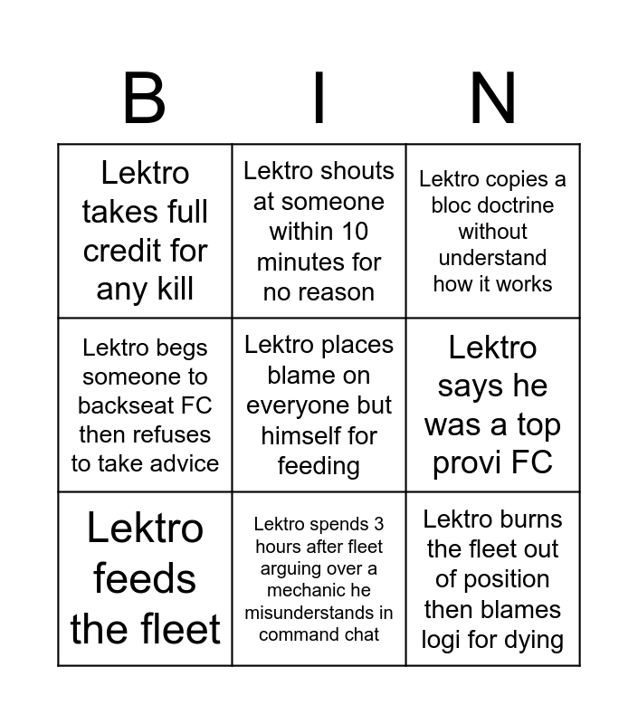 This bingo card has a free space and 8 words: Lektro says he was a top provi FC, Lektro copies a bloc doctrine without understand how it works, Lektro shouts at someone within 10 minutes for no reason, Lektro feeds the fleet, Lektro takes full credit for any kill, Lektro burns the fleet out of position then blames logi for dying, Lektro begs someone to backseat FC then refuses to take advice and Lektro spends 3 hours after fleet arguing over a mechanic he misunderstands in command chat.