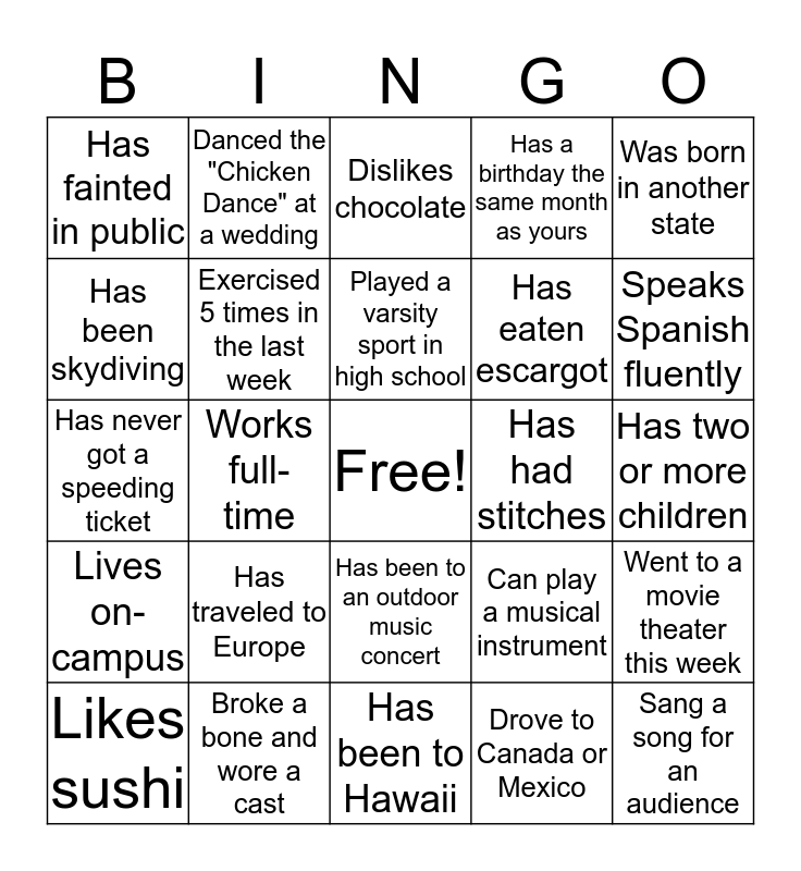 This bingo card has a free space and 24 words: Has traveled to Europe, Broke a bone and wore a cast, Played a varsity sport in high school, Likes sushi, Was born in another state, Has fainted in public, Has been skydiving, Danced the "Chicken Dance" at a wedding, Has had stitches, Has been to an outdoor music concert, Has eaten escargot, Has never got a speeding ticket, Can play a musical instrument, Went to a movie theater this week, Exercised 5 times in the last week, Drove to Canada or Mexico, Has two or more children, Dislikes chocolate, Speaks Spanish fluently, Works full-time, Sang a song for an audience, Lives on-campus, Has a birthday the same month as yours and Has been to Hawaii.