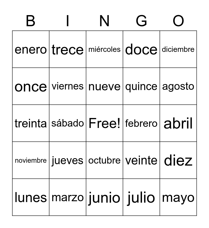 This bingo card has a free space and 29 words: lunes, martes, sábado, domingo, enero, miércoles, viernes, jueves, febrero, marzo, abril, mayo, junio, julio, agosto, septiem bre, octubre, noviembre, diciembre, treinta, veinte, catorce, quince, once, doce, trece, diez, nueve and ocho.