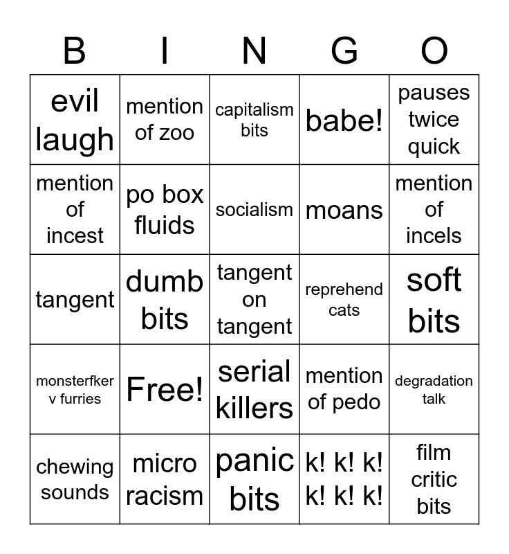 This bingo card has a free space and 24 words: Free!, micro racism, socialism, chewing sounds, pauses twice quick, evil laugh, mention of incest, mention of zoo, reprehend cats, serial killers, moans, tangent, mention of pedo, degradation talk, po box fluids, k! k! k! k! k! k!, soft bits, capitalism bits, mention of incels, dumb bits, film critic bits, monsterfker v furries, babe! and panic bits.