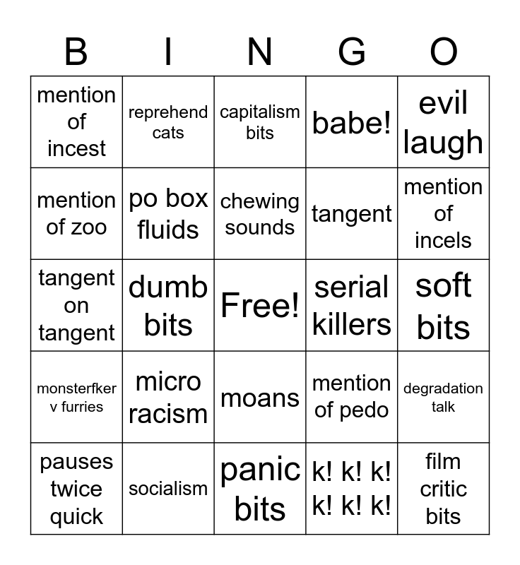 This bingo card has a free space and 24 words: micro racism, socialism, chewing sounds, pauses twice quick, evil laugh, mention of incest, mention of zoo, reprehend cats, serial killers, moans, tangent, tangent on tangent, mention of pedo, degradation talk, po box fluids, k! k! k! k! k! k!, soft bits, capitalism bits, mention of incels, dumb bits, film critic bits, monsterfker v furries, babe! and panic bits.