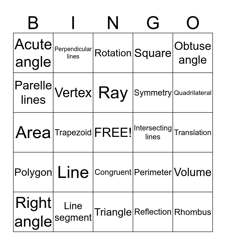 This bingo card has a free space and 24 words: Line, Line segment, Ray, Right angle, Obtuse angle, Acute angle, Parelle lines, Perpendicular lines, Intersecting lines, Congruent, Symmetry, Area, Perimeter, Volume, Vertex, Reflection, Translation, Rotation, Quadrilateral, Trapezoid, Rhombus, Polygon, Square and Triangle.