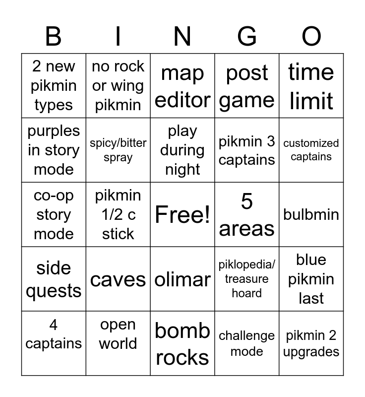 This bingo card has a free space and 24 words: caves, open world, play during night, 4 captains, time limit, 2 new pikmin types, purples in story mode, no rock or wing pikmin, 5 areas, olimar, pikmin 3 captains, co-op story mode, piklopedia/ treasure hoard, blue pikmin last, spicy/bitter spray, challenge mode, bulbmin, map editor, customized captains, pikmin 1/2 c stick, pikmin 2 upgrades, side quests, post game and bomb rocks.