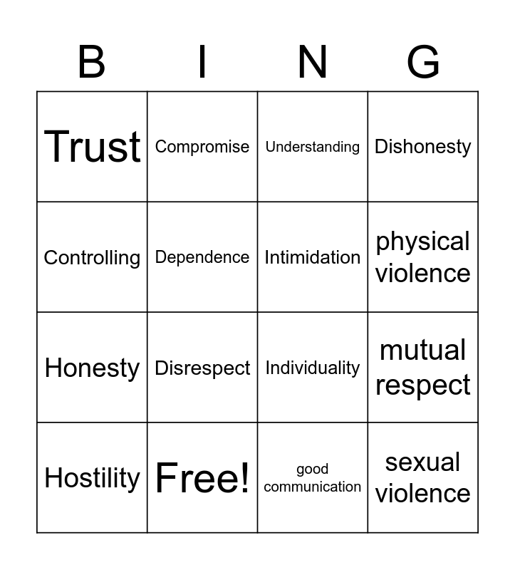 This bingo card has 16 words: Free!, mutual respect, Understanding, Trust, Honesty, Compromise, Individuality, good communication, Controlling, Dependence, Hostility, Dishonesty, Disrespect, physical violence, Intimidation and sexual violence.