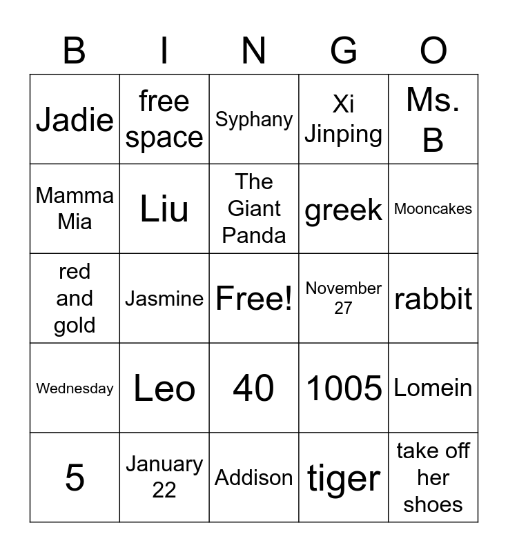 This bingo card has a free space and 31 words: Addison, camille, Jasmine, Jennifer, Jadie, Syphany, Liu, 1005, November 27, tiger, rabbit, take off her shoes, Last week of October, Dumplings, Mooncakes, Beijing, Lomein, Leo, Wednesday, 40, Ms. B, 4, 5, free space, greek, Mamma Mia, Xi Jinping, red and gold, January 22, The Giant Panda and Shanghai.