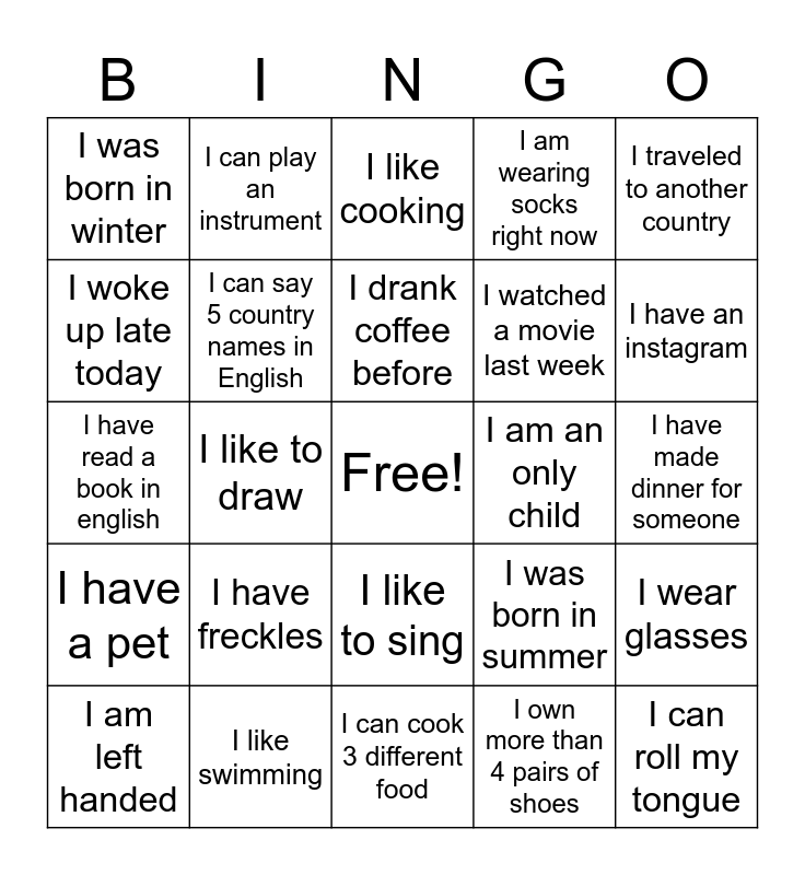 This bingo card has a free space and 24 words: I have freckles, I like swimming, I drank coffee before, I am left handed, I traveled to another country, I was born in winter, I woke up late today, I can play an instrument, I am an only child, I like to sing, I watched a movie last week, I have read a book in english, I was born in summer, I wear glasses, I can say 5 country names in English, I own more than 4 pairs of shoes, I have made dinner for someone, I like cooking, I have an instagram, I like to draw, I can roll my tongue, I have a pet, I am wearing socks right now and I can cook 3 different food.