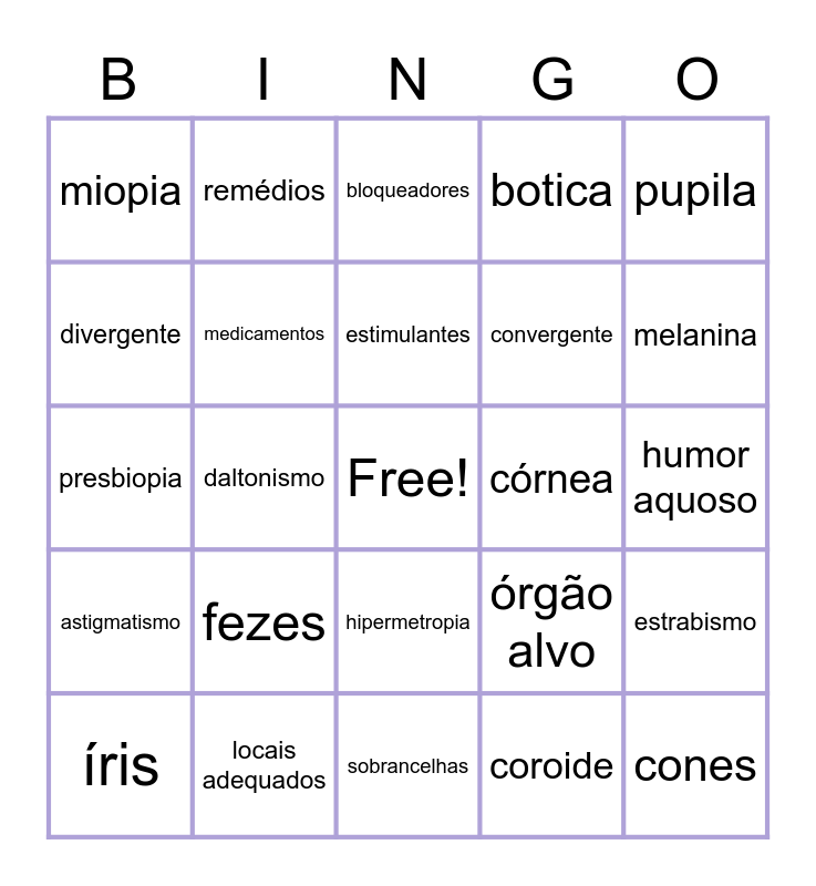 This bingo card has a free space and 34 words: Snc, coroide, bastonetes, corpo ciliar, astigmatismo, medicamentos, pupila, íris, remédios, cristalino, estimulantes, bloqueadores, imunizar, cilíndrica, córnea, melanina, locais adequados, presbiopia, fezes, órgão alvo, hipermetropia, humor vítreo, miopia, humor aquoso, sobrancelhas, cones, botica, nervo óptico, convergente, divergente, esclera, daltonismo, estrabismo and aliviar dores.