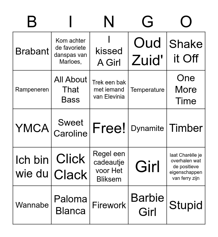 This bingo card has a free space and 66 words: Vraag aan Sacha iets over haarzelf (alleen afstrepen als ze 3 verkleinwoorden heeft gebruikt), Vraag aan Anouk over haar favoriete groene ding, Vraag aan Zhen op wat voor boerderij ze woont, laat Charèlle je overhalen wat de positieve eigenschappen van ferry zijn, Laat Maaike je overhalen waarom vlaai verschilt van taart, Kom achter het favoriete snoep van Sanne, Kom achter de favoriete danspas van Marloes,, Vraag aan Martje om een samenvatting van PSV- Feyenoord, Trek een bak met iemand van Elevinia, Laat iemand van Elevinia een bak trekken, Regel een cadeautje voor Het Bliksem, Zing een liedje helemaal mee op de bar, Timber, Shake it Off, Feel this moment, Rampeneren, Sweet Caroline, Brabant, Bagagedrager, Temperature, Click Clack, Ich bin wie du, Oud Zuid', Cotton Eye Joe, Daddy Cool, Sexbomb, Maak Me Gek, Een Zomeravond Met Jou, Stupid, Bubbelbad, Wannabe, Lets Get Loud, Honey, Honey, Sterrenstof, Girl, Paloma Blanca, The Ketchup Song, YMCA, Barbie Girl, Dromen Zijn Bedrog, All About That Bass, Whistle, Dynamite, Het Regent Zonnestralen, So What, Trumpets, One More Time, Unwritten, Party in the U.S.A, All Star, Classic, A Thousand Miles, Boyfriend, Zusje, Baby, Umbrella, Billionaire, Airplanes, I kissed A Girl, Firework, Hot N Cold, Payphone, It Girl, Waka Waka, Hangover and Bleeding Love.