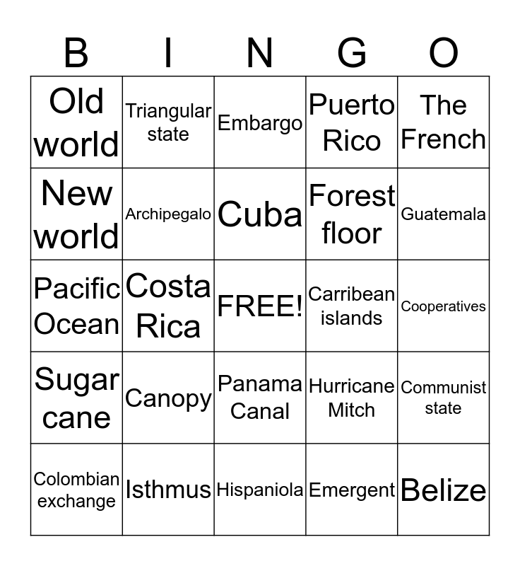 This bingo card has a free space and 24 words: Canopy, Isthmus, Cuba, Colombian exchange, The French, Old world, New world, Triangular state, Carribean islands, Panama Canal, Forest floor, Pacific Ocean, Hurricane Mitch, Communist state, Archipegalo, Emergent, Cooperatives, Embargo, Guatemala, Costa Rica, Belize, Sugar cane, Puerto Rico and Hispaniola.